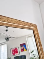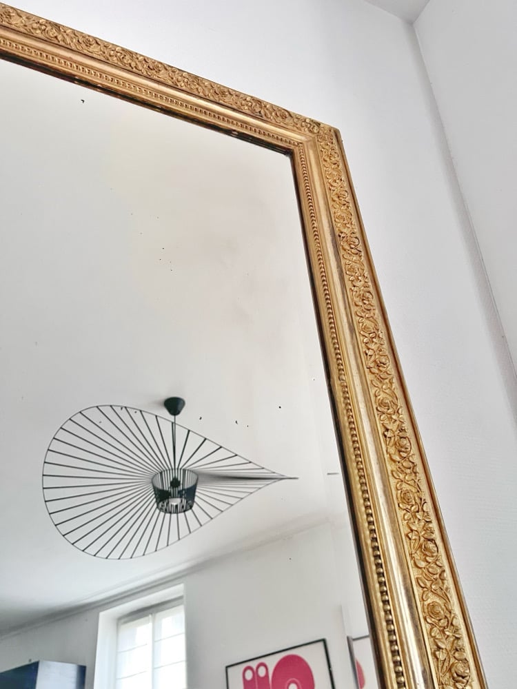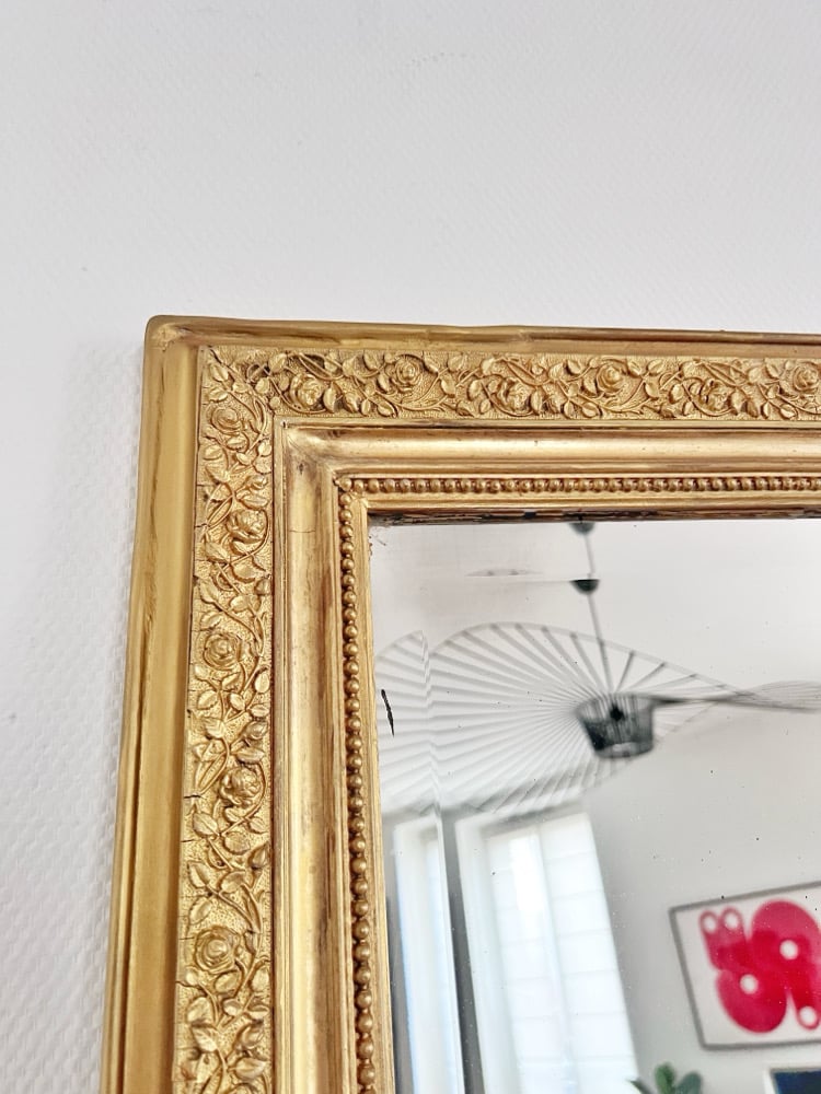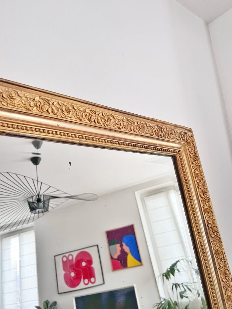 Miroir ancien entièrement repatiné époque début 20eme, glace d’origine biseautée légèrement rayée, piquée et floue.