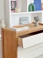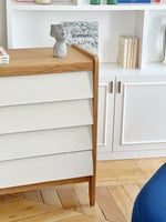 Les tiroirs ont été repatinés en blanc afin de faire ressortir la couleur naturelle du bois et apporter de la luminosité.
