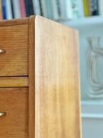 Commode vintage des années 1950–1960 en bois et placage bois, présentant une belle teinte naturelle et chaleureuse.